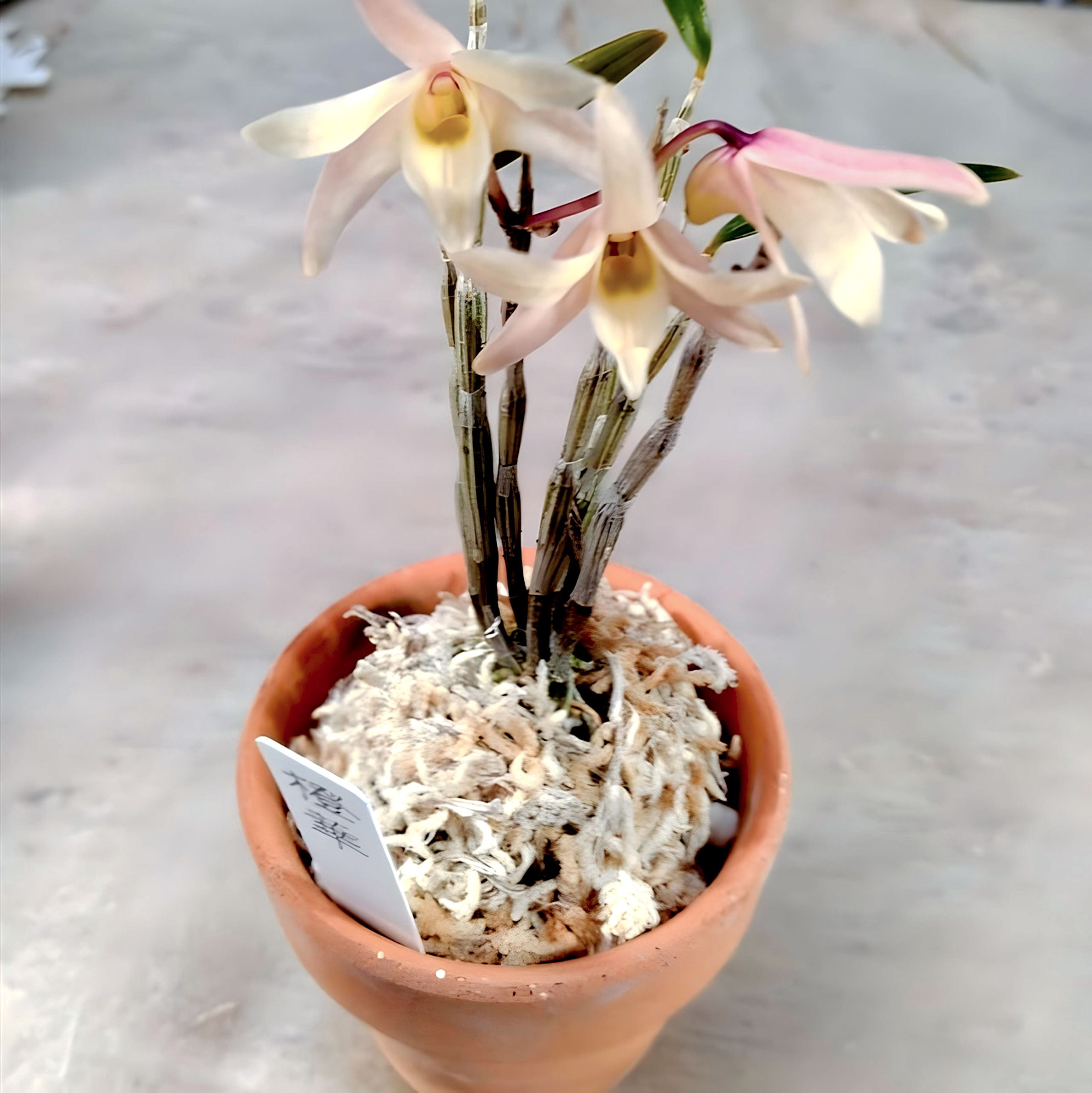 橙華は、淡いオレンジの花弁にピンクが散って、花色のグラデーションが美しいセッコクですやわらかな花色は、セッコク特有の甘い香りと共に楽しんでいただけると思います。