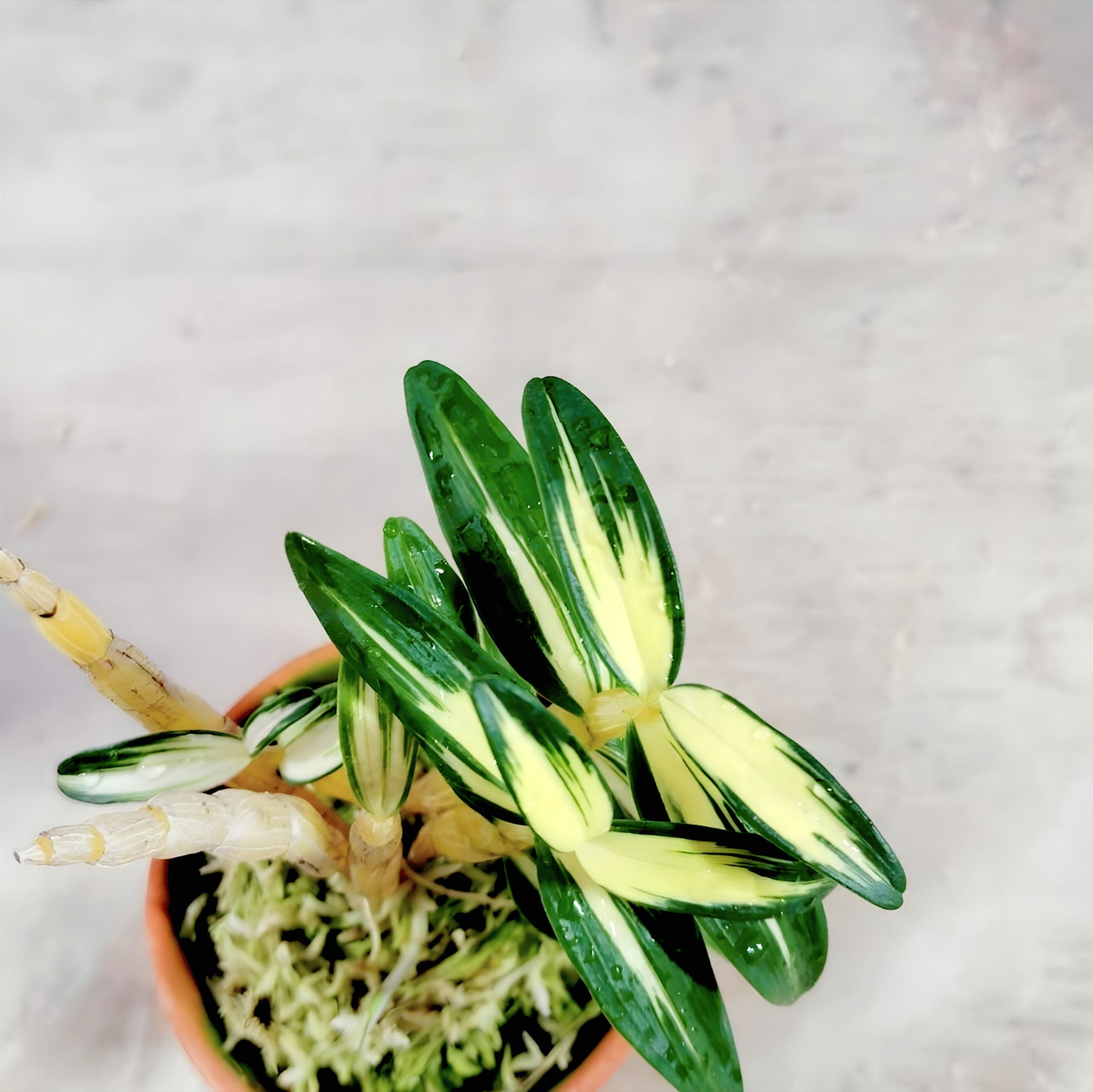 富貴の光は、紅小町の芽代わりで、平成30年(令和元年)に登録された日本原産の着生蘭で、セッコクの中でも長生蘭に分類される、斑入りの葉が魅力的な品種です。
