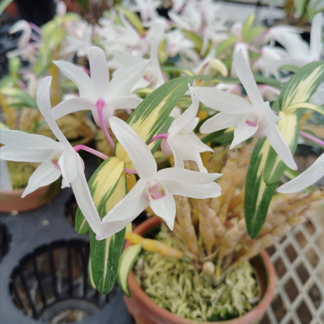 富貴の光は、斑入りの葉が美しく、ピンクの花を咲かせるセッコクです。